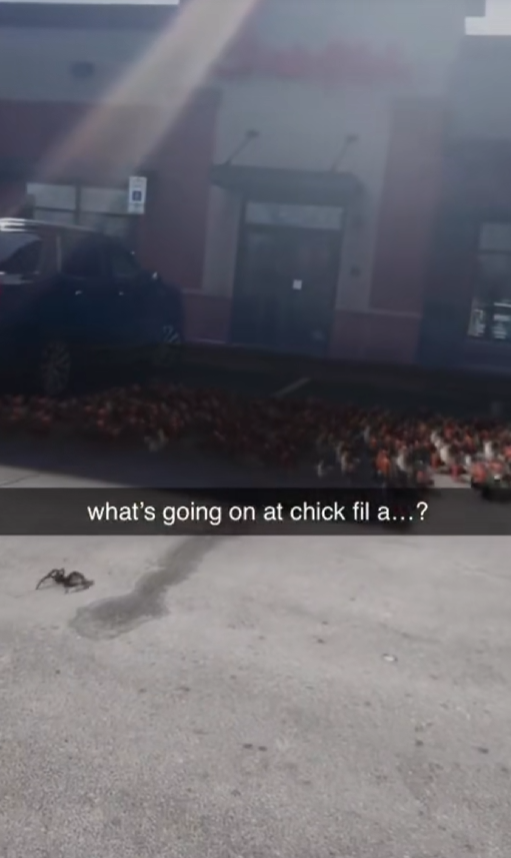 Tim running towards Chick-fil-A with chickens (Feb 25 2025)