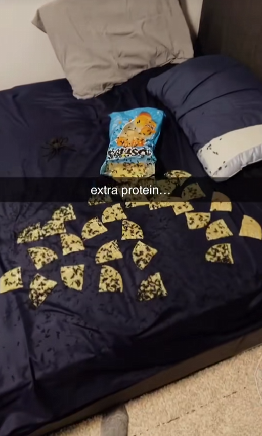 Tim chilling on the bed while I eat chips with ants (Mar 5 2025)